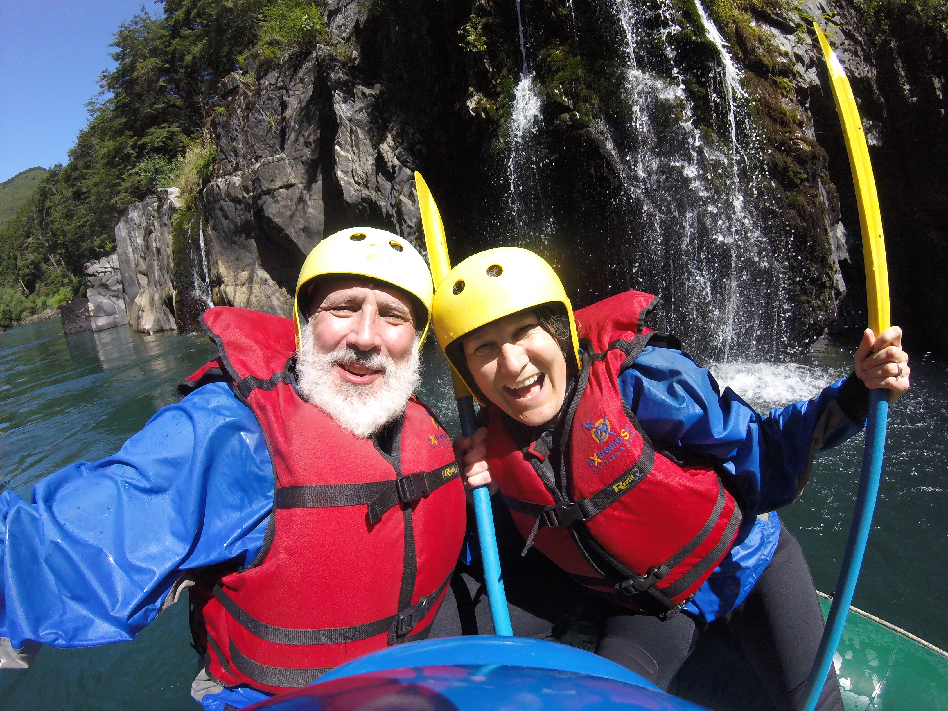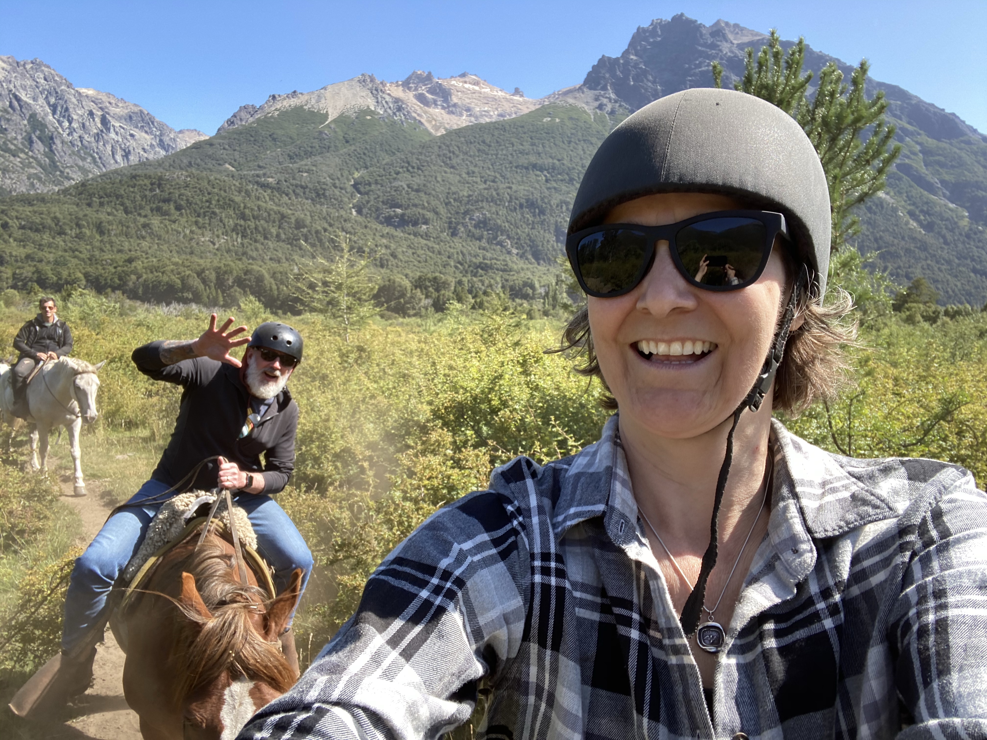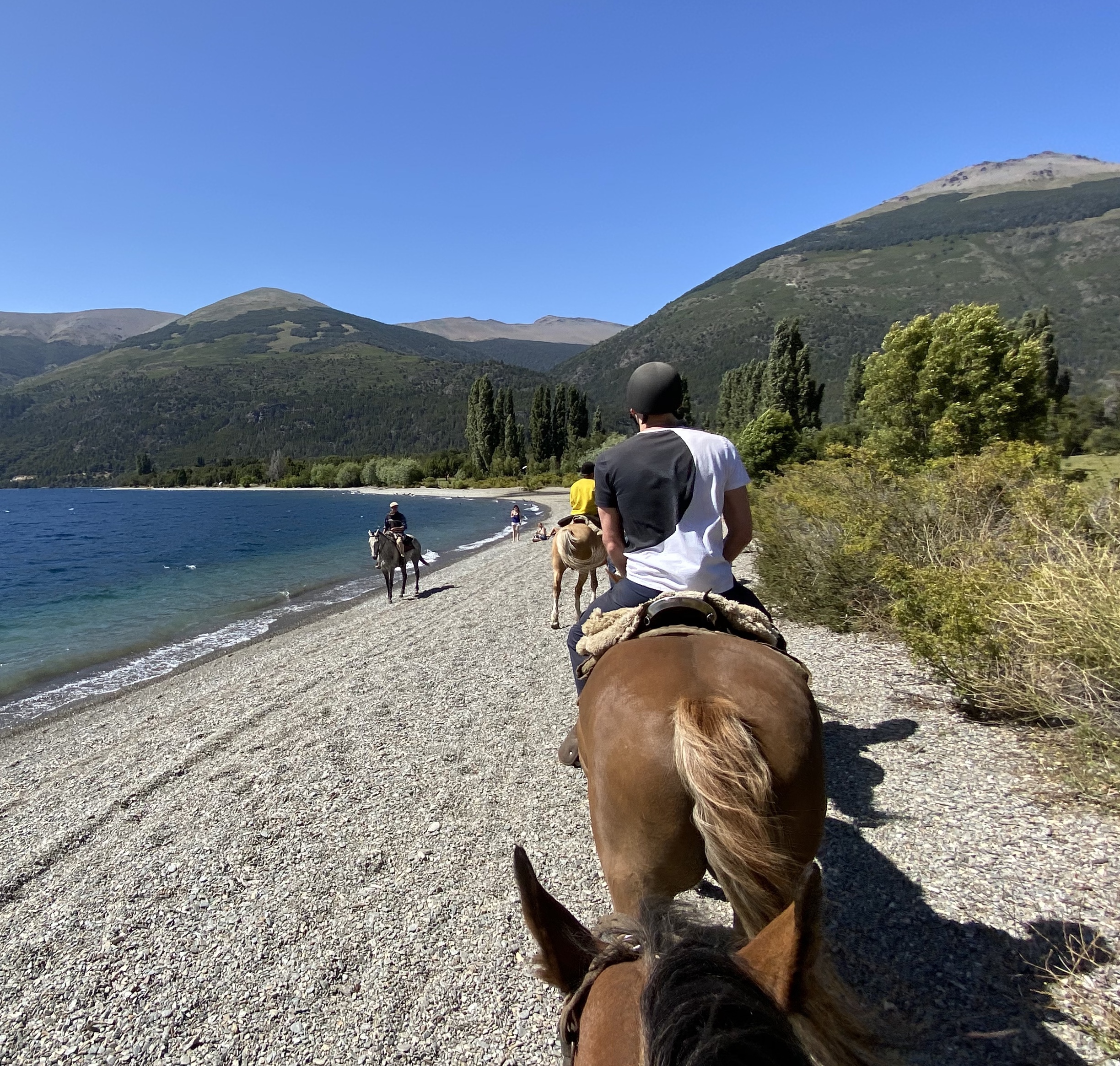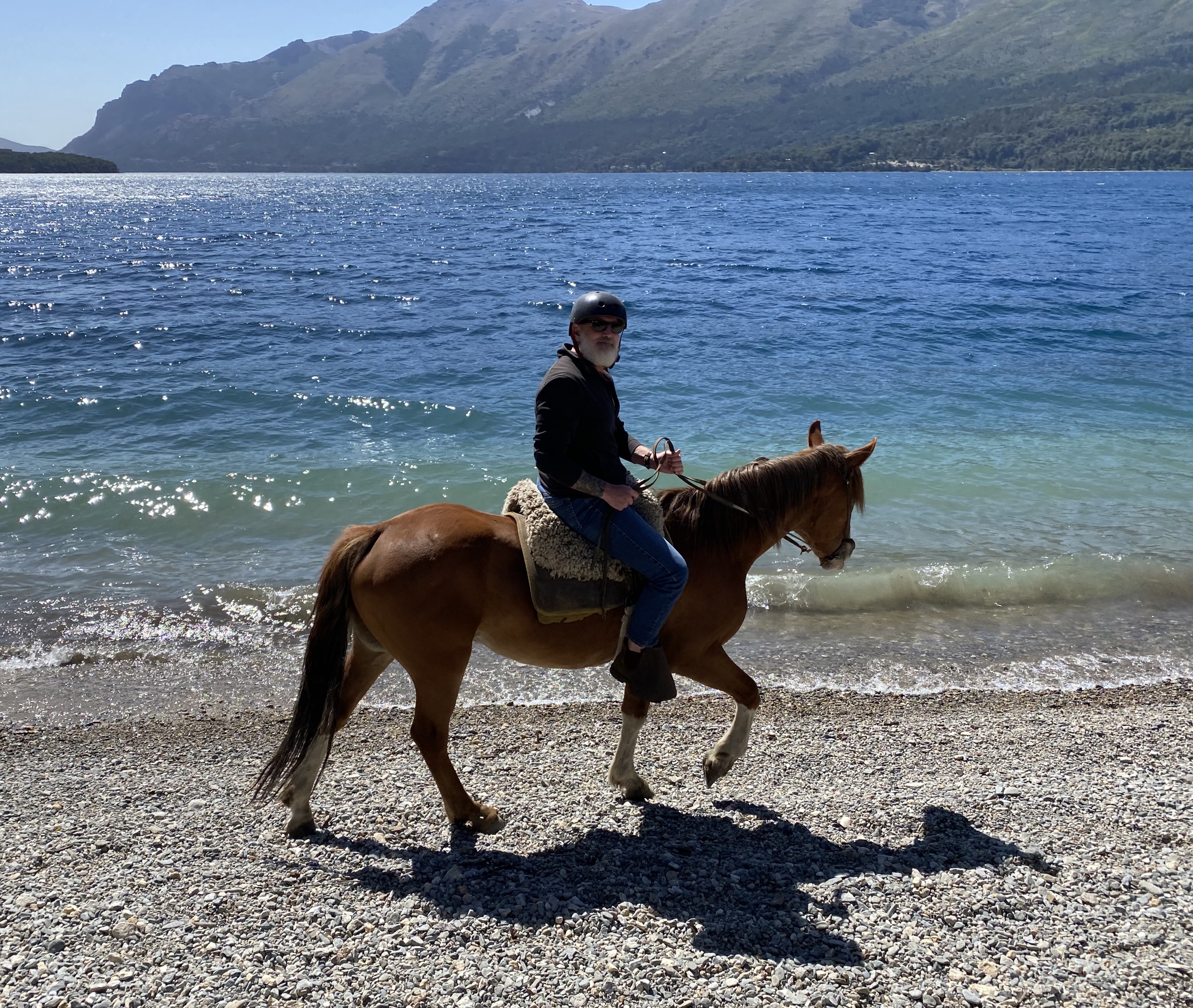 Bariloche served as our base for some fun activities – white water rafting on the Rio Manso as well as a day of horseback riding on a local estancia. On the horseback ride, four farm dogs followed us the whole way – apparently that is their job and they take it pretty seriously – until they get to the lake, then they just frolic in the water! The trail was dusty and the horses were pretty docile but we rode through a beautiful valley and along the most spectacular blue lake before heading back to the ranch for some traditional Argentinian asado barbecue. Warren definitely got his meat fix!