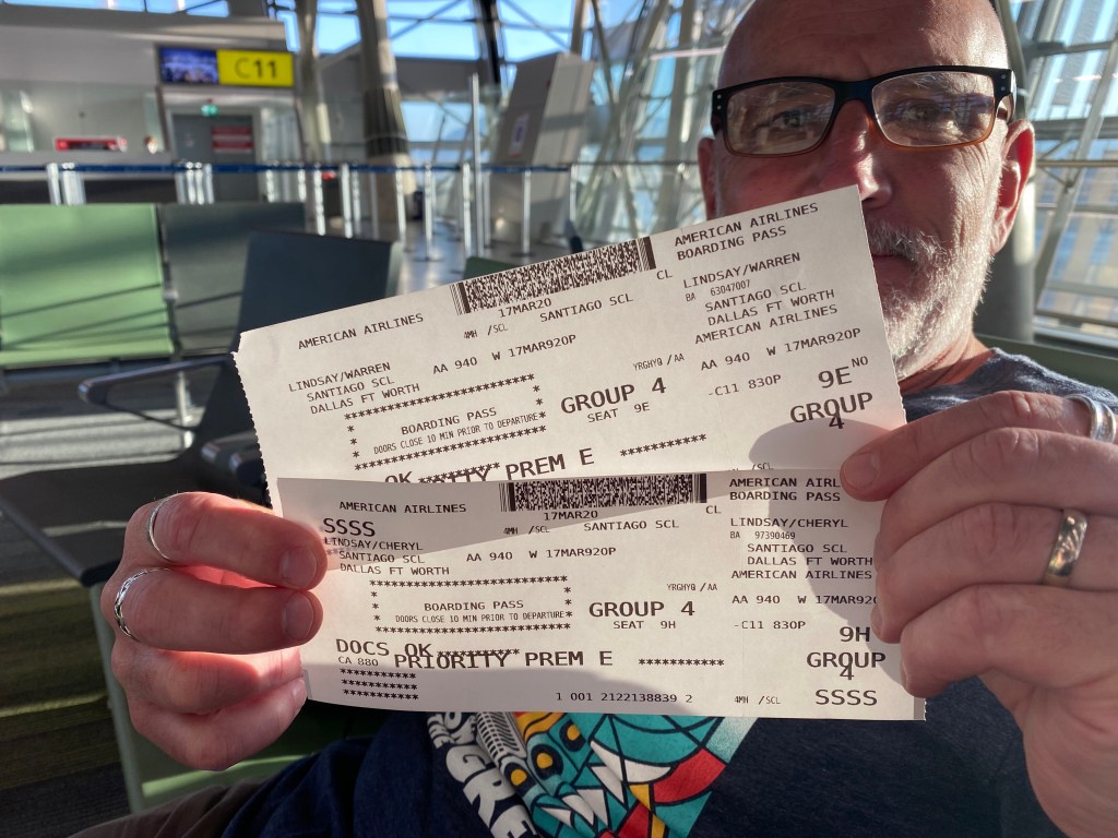 The next day we packed up, checked out of our Airbnb and headed back to the airport where we sat on pins and needles for a few hours until we could check in. By this time we were hearing stories from friends and in the news of airlines just abandoning passengers in Morocco and elsewhere as borders were closing. So even though we had tickets in hand, nothing felt assured. To make matters worse, even after we checked our bags and cleared security, the airline still did not have confirmed seats for us. Fortunately about an hour before our scheduled departure time, we went to the gate agent (again!) and this time they could actually assign us seats. Phew! We departed just before 10:00 p.m. on what ended up being the last American Airlines flight out of Chile since.