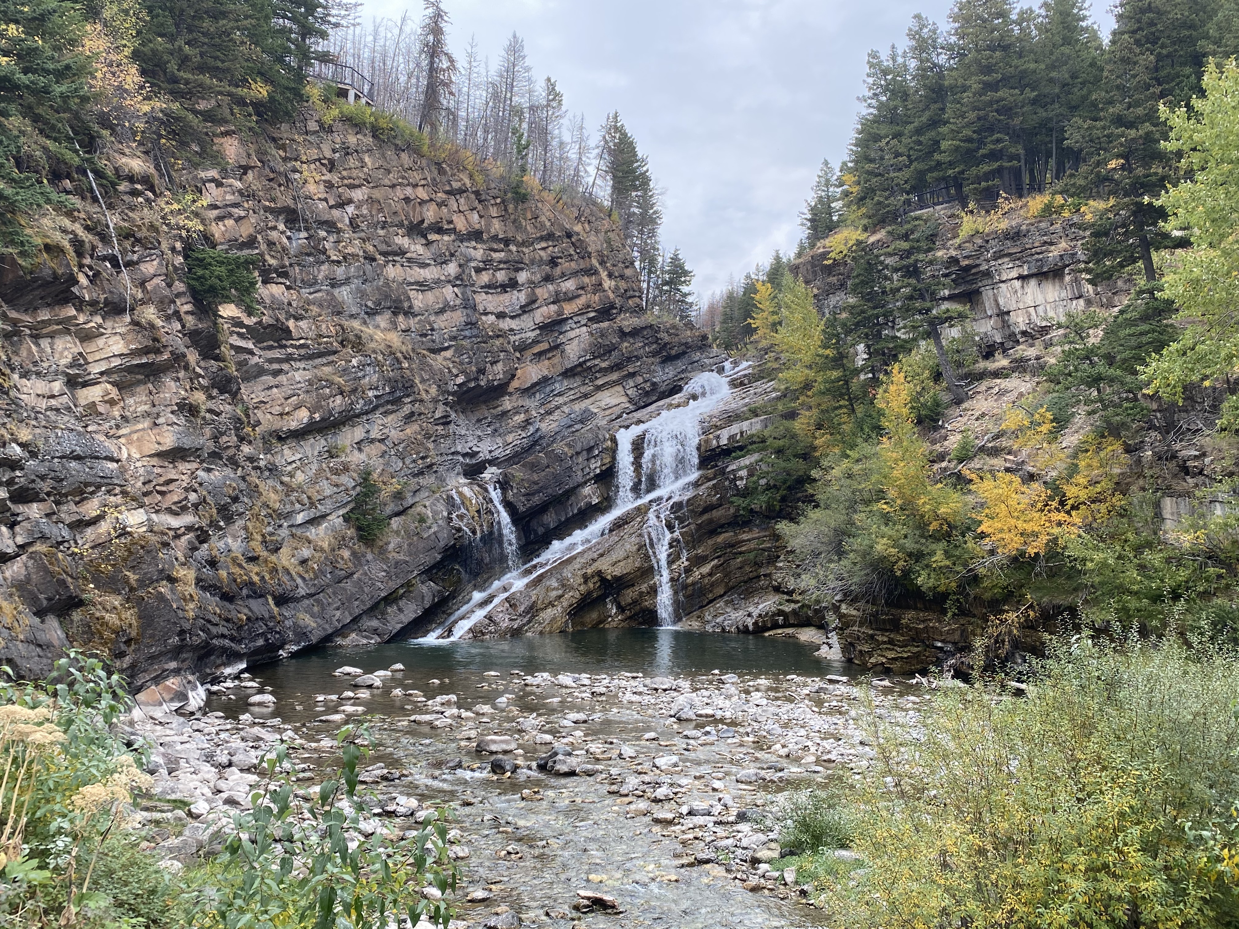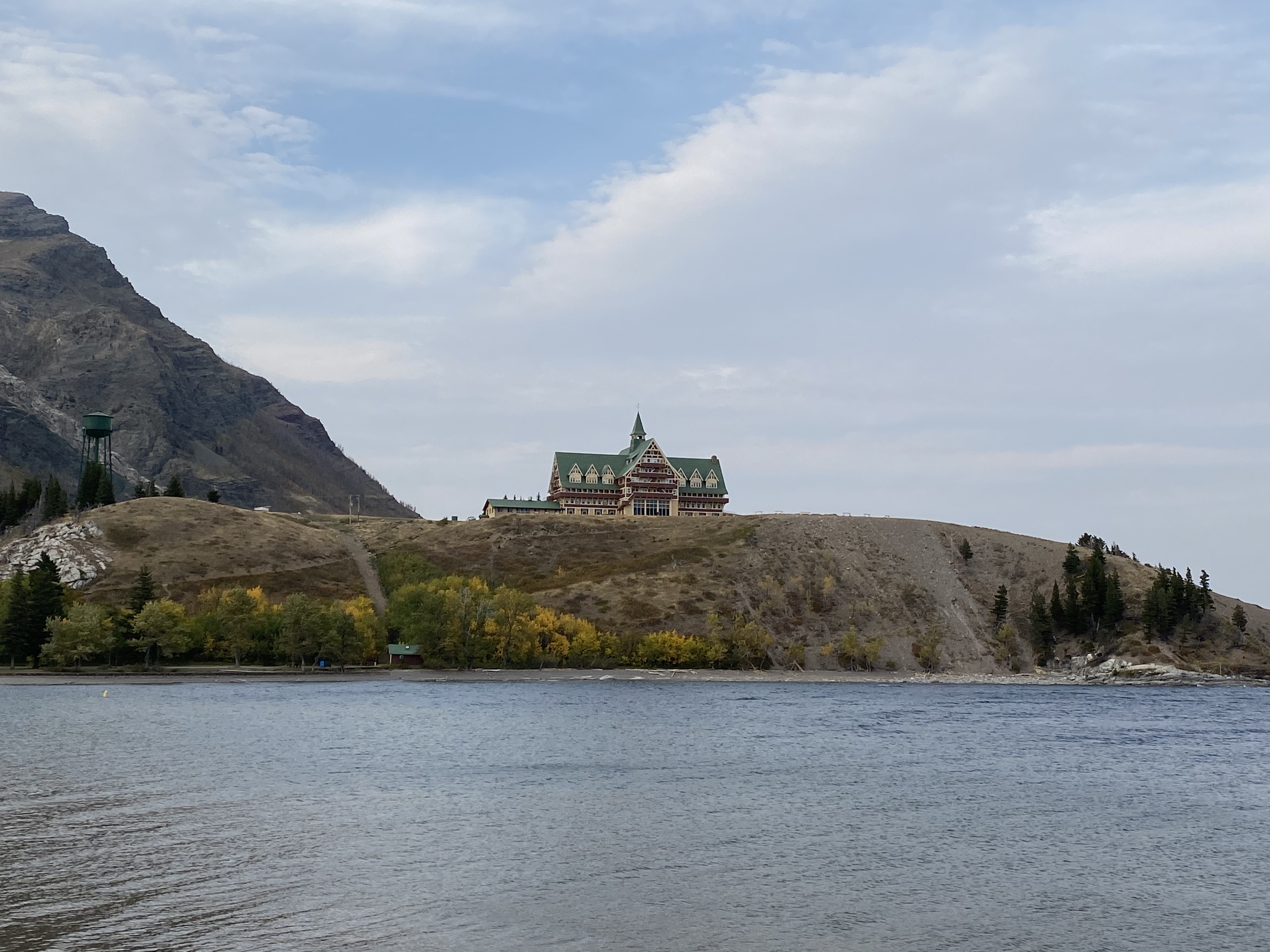 We arrived in Waterton Lakes National Park at the beginning of October to do a little fall hiking. Waterton Lakes is located in the mountainous tri-border area between BC, Alberta and the United States. South of the border, the park joins with Glacier National Park to create a pretty amazing and expansive opportunity for outdoor adventure! Last year at this time, the park was already under several feet of snow….this year it was beautiful and sunny with daytime highs of 20 degrees! Park services were starting to shut down for the winter and with school back in session, we didn’t think we would have any issue finding a spot to camp. We were sadly mistaken! Apparently many folks were out to enjoy the last bit of summer-like weather in Southern Alberta. Our first night in the park was actually spent in a parking lot with a dozen or so other campers as the campsites were all full! Fortunately we got up early and beat the crowd to snag a proper campsite for the next couple of nights. Didn’t really matter though – seeing the lakeshore from our back window was cool wherever we parked!