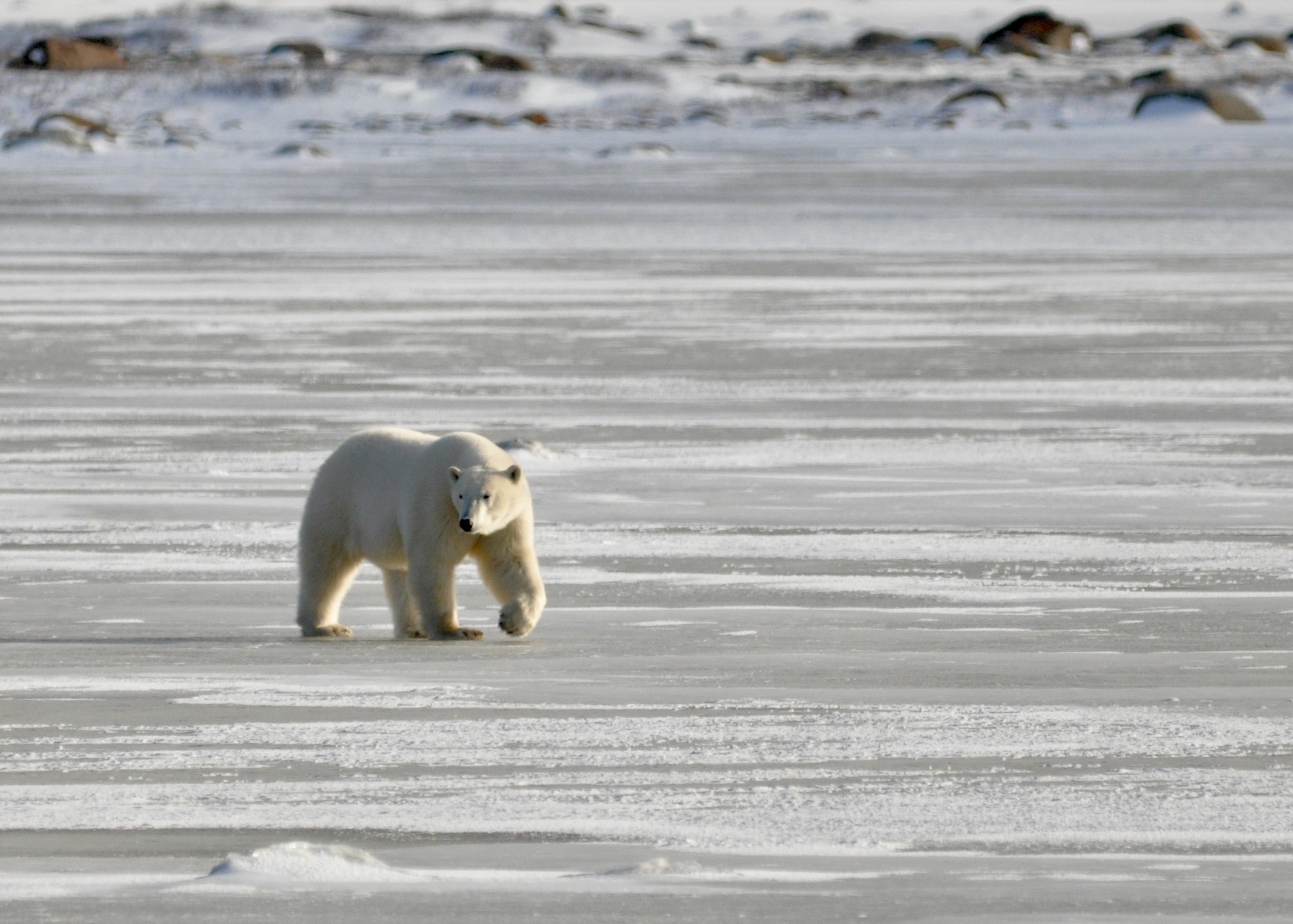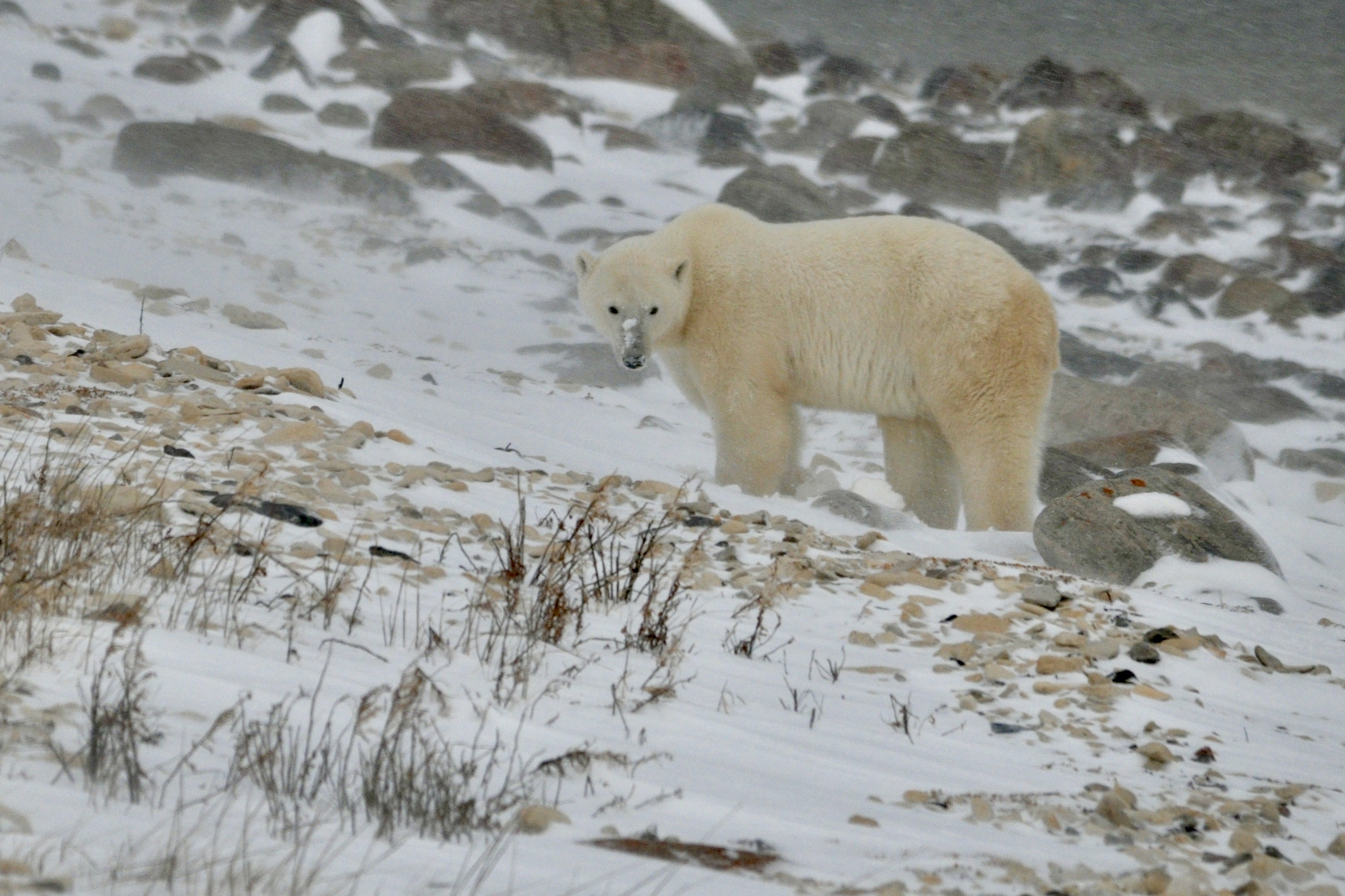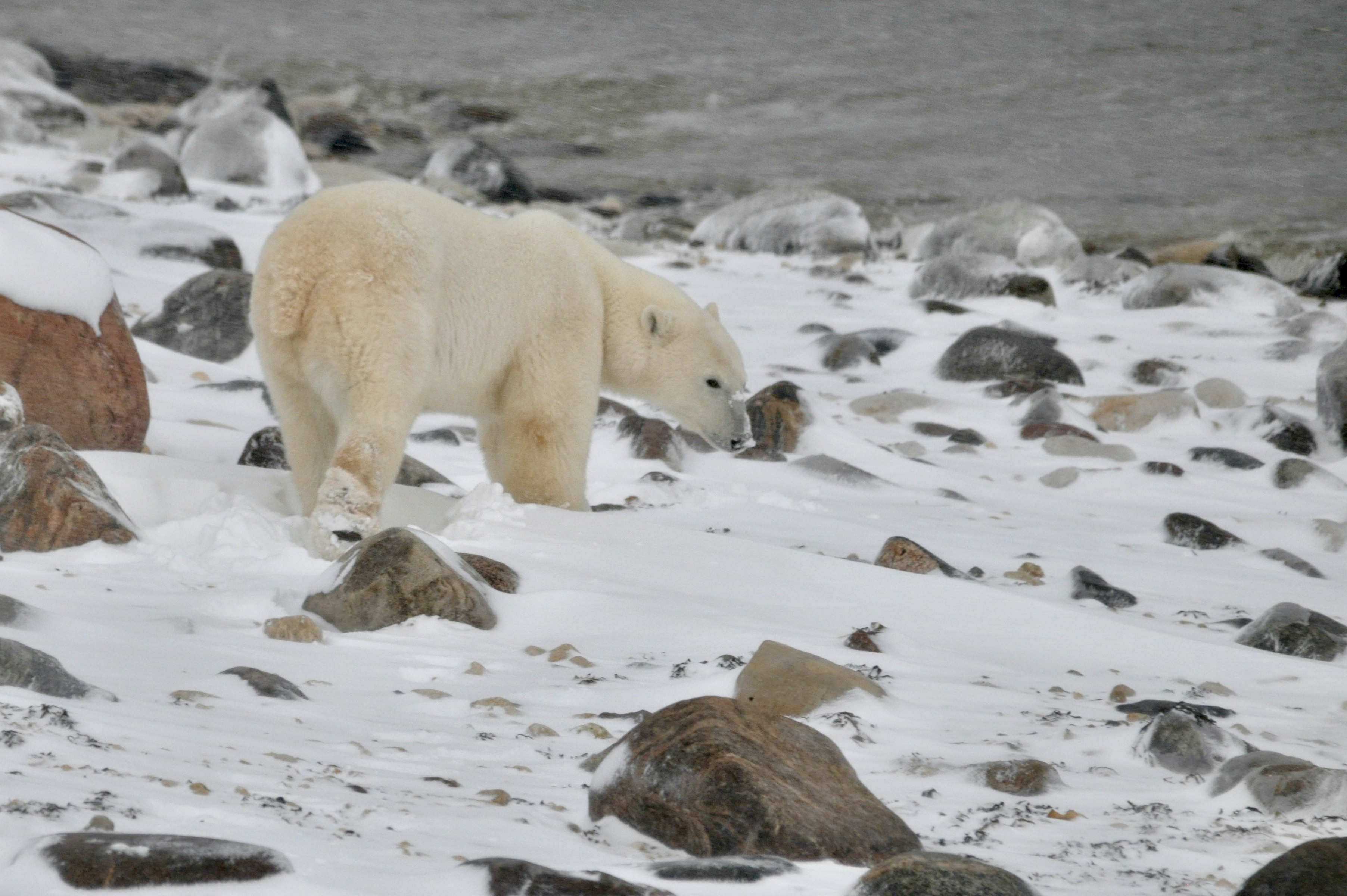 By October, the bears on land have been going without food for the past few months, while the bay is ice free. They have been using up their massive stores of fat to keep themselves over the summer until they can hunt again. Understandably, they are pacing and waiting rather impatiently for the ice to form. Once they can access the seals, they will hunt, feast and start to replenish their fat stores, hopefully enough to keep them over next summer when the cycle starts all over again.