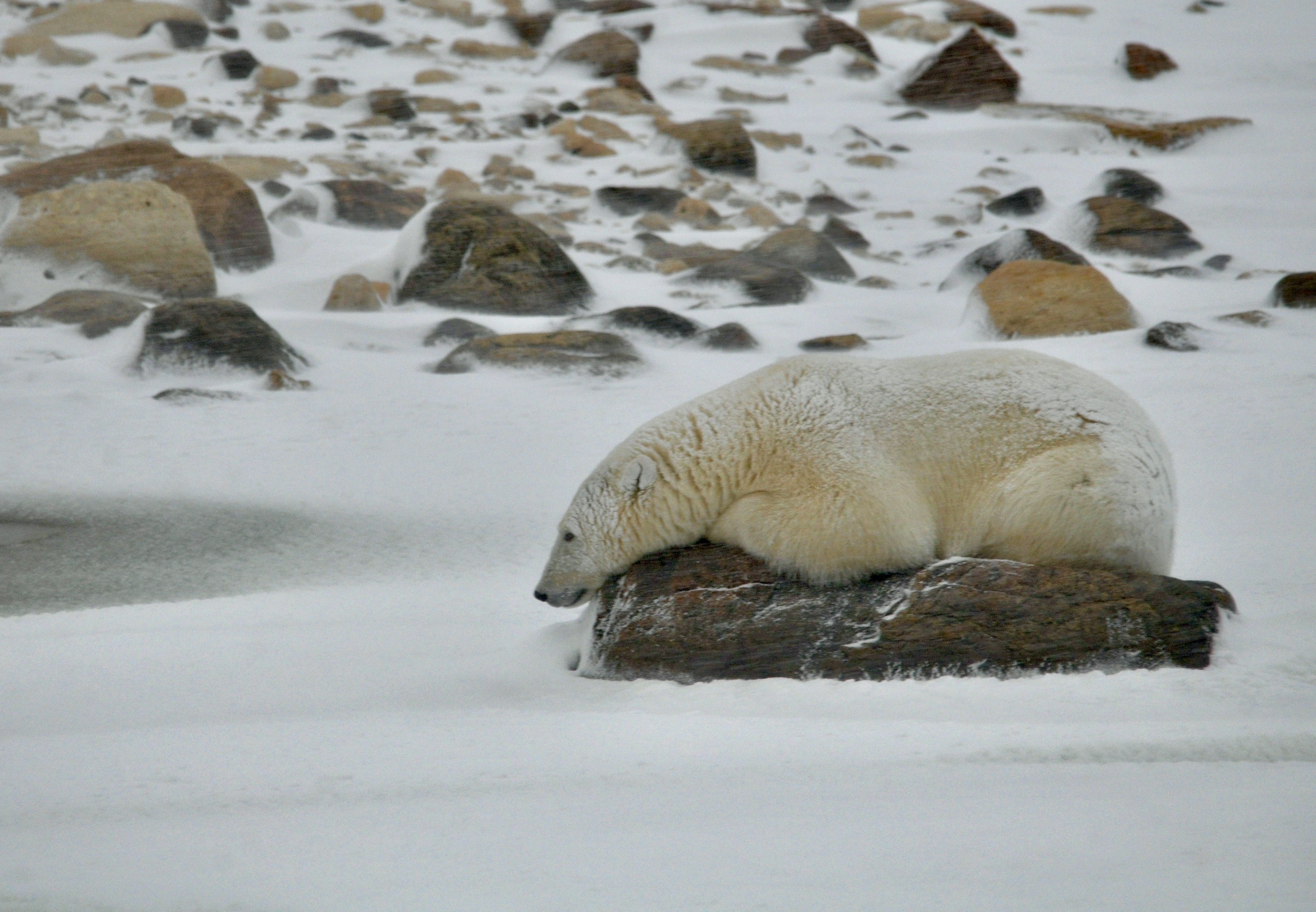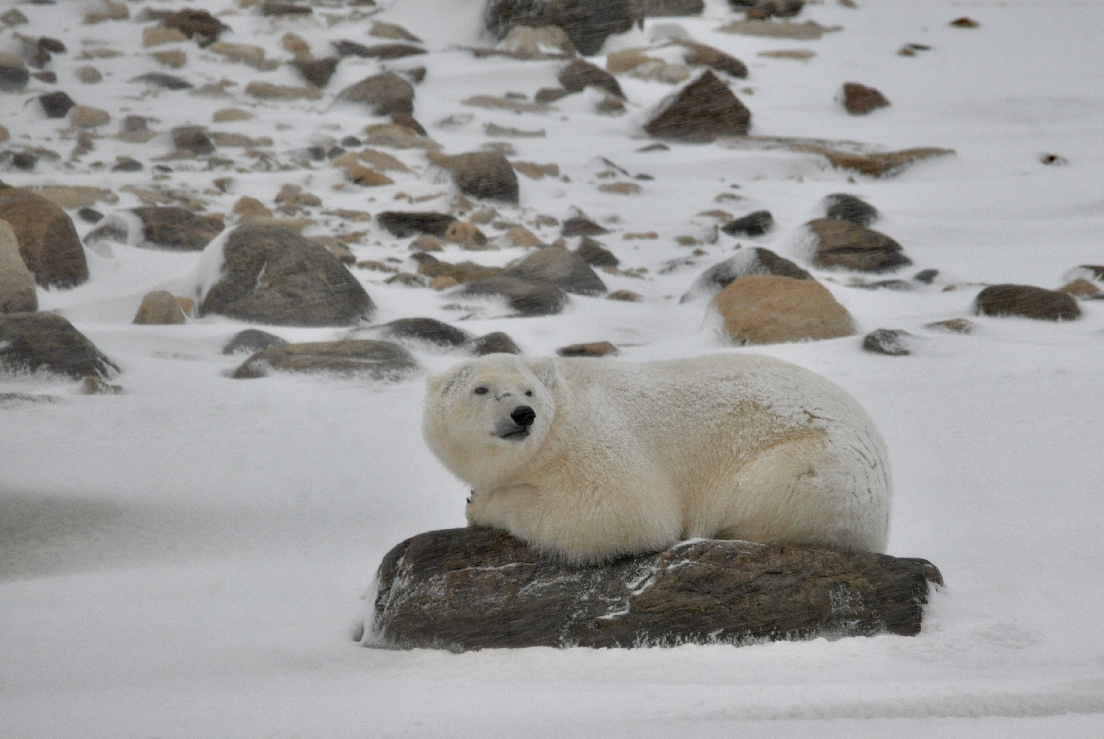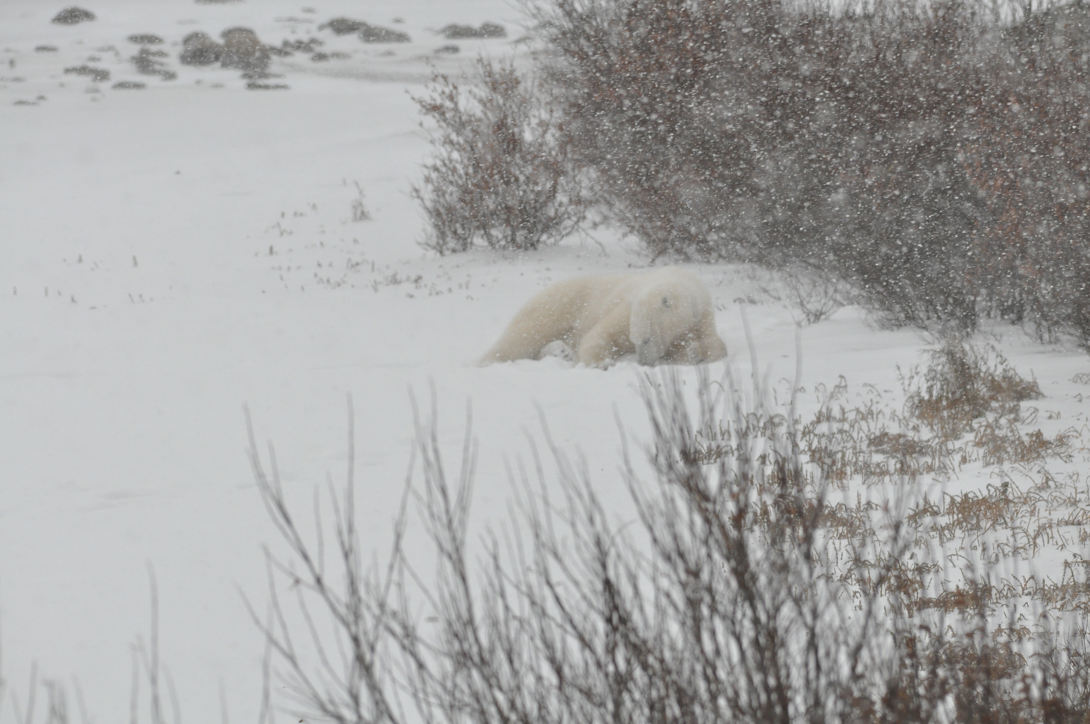 After lunch things started to heat up – at least for bear sightings! We saw another eight or so individuals, doing bear things like digging in the snow, walking on the tundra or taking a bear-nap on a rock. One of the scientists accompanying us from the Assiniboine Park Conservancy pulled out a thermal camera and aimed it at one bear who was napping on a rock. We expected to see lots of colour showing the heat coming off of the bear. Surprisingly though, we saw next to nothing on the image. The bears are so well adapted to living on the ice and their fur insulates them so well that they lose very little body heat to the environment. Mother nature truly is amazing!